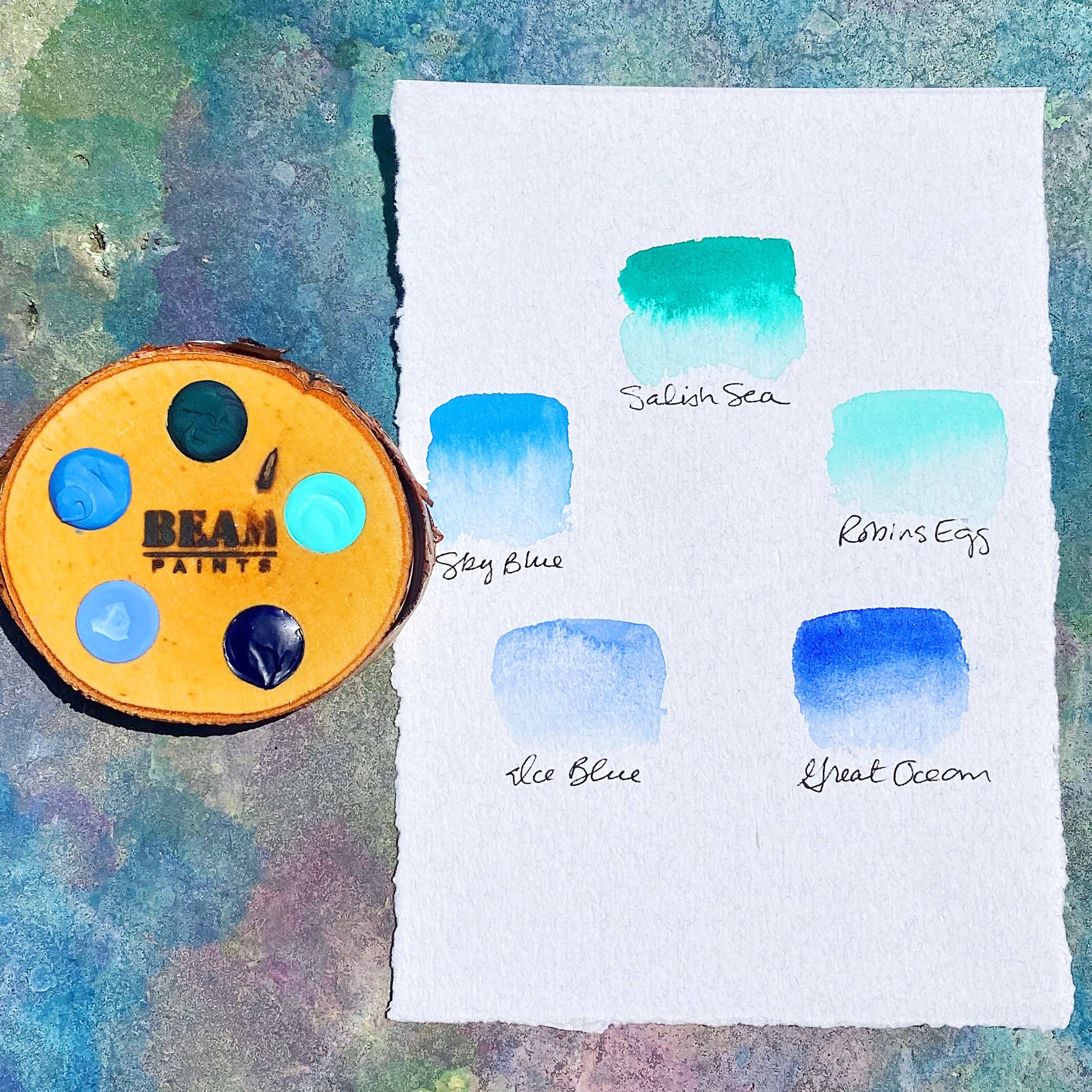 Deep and Penetrating Salish Sea, light and dreamy Robins Egg Blue, clean and clear Great Ocean, chill Ice Blue, and the always azure Sky Blue round out this summer set!